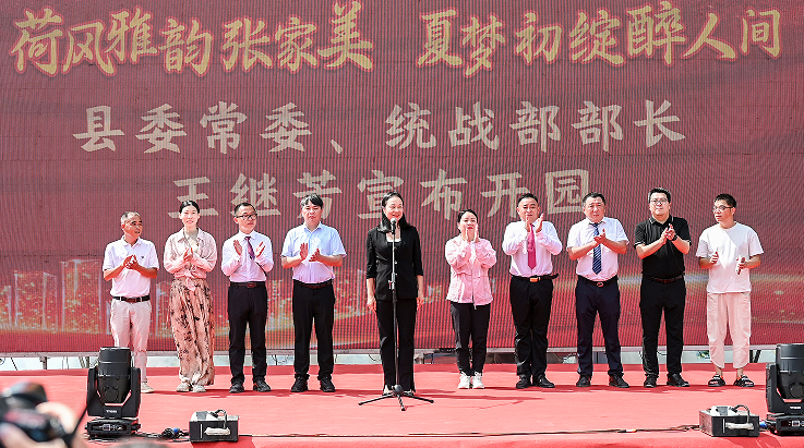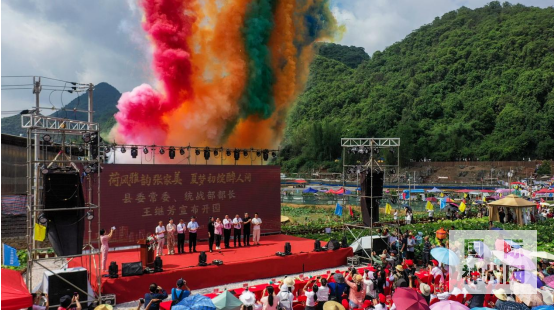 ▲平乐县县委常委、统战部部长王继芳宣布“集缘荷苑”荷花周开园。(摄影:唐培穗)