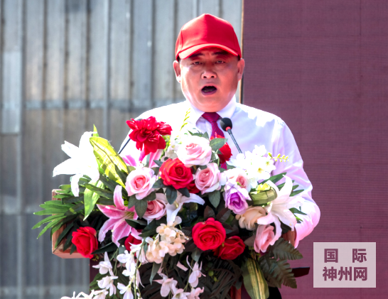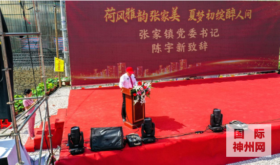▲平乐县张家镇党委书记陈宇新在“集缘荷苑”荷花周开幕式上致辞。(摄影:唐培穗)