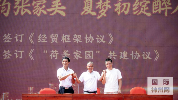 ▲在“集缘荷苑”荷花周开幕式上签订《经贸框架协议》、《“荷美家园”共建协议》。(摄影:唐培穗)