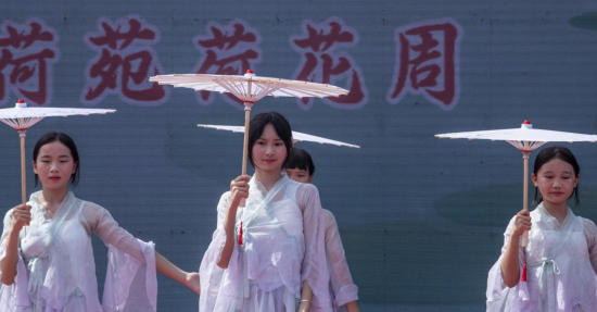 ▲在“集缘荷苑”荷花周开幕式初中女生的精彩演出。(摄影:唐培穗)