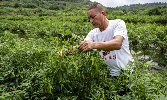 ▲蒋正生(在辣椒种植基地调研。(摄影:唐培穗)