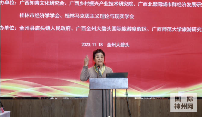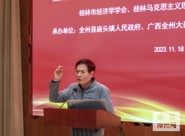 图为桂林市经济学学会会长王清荣研究员:旅游龙头企业助力农村三次产业融合发展探讨一一一以大碧头国际旅游度假区为例的报告并主持研讨会。