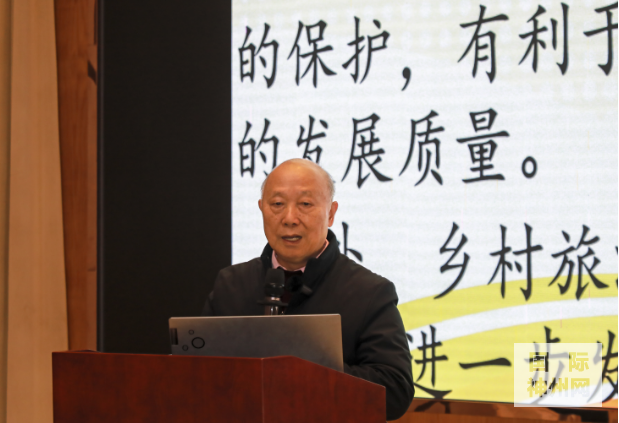 图为原广西大学党委书记、博士生导师阳国亮教授:“文旅赋能乡村振兴三问”为题作主旨演讲。