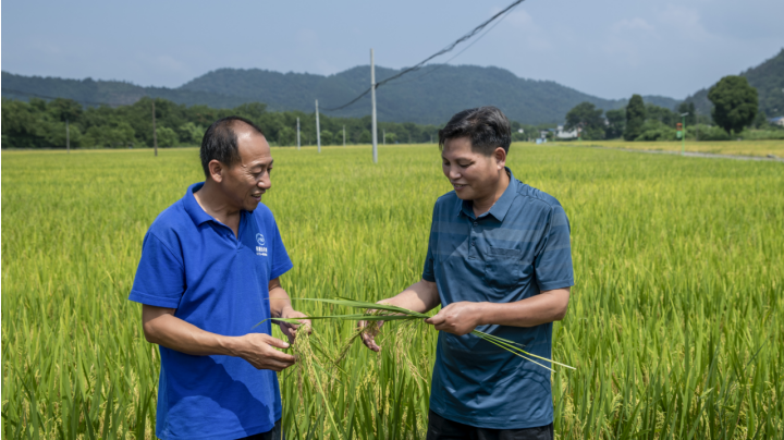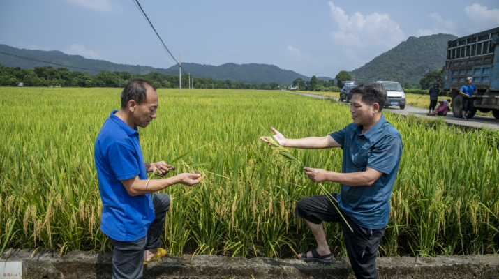 ▲广西桂林中禾现代农业开发有限公司负责人蒋春赋(左)与庙头镇农业推广站负责人蒋锦辉(右)在察看早稻结穗情况。(摄影:蒋杰)
