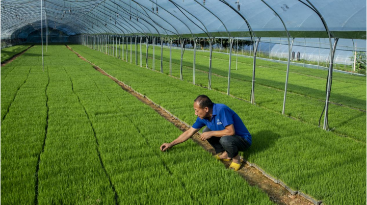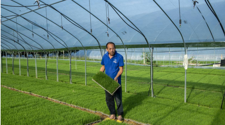 ▲广西桂林中禾现代农业开发有限公司负责人蒋春赋在公司育秧大棚察看晚稻秧苗生长情况。(摄影:唐培穗)